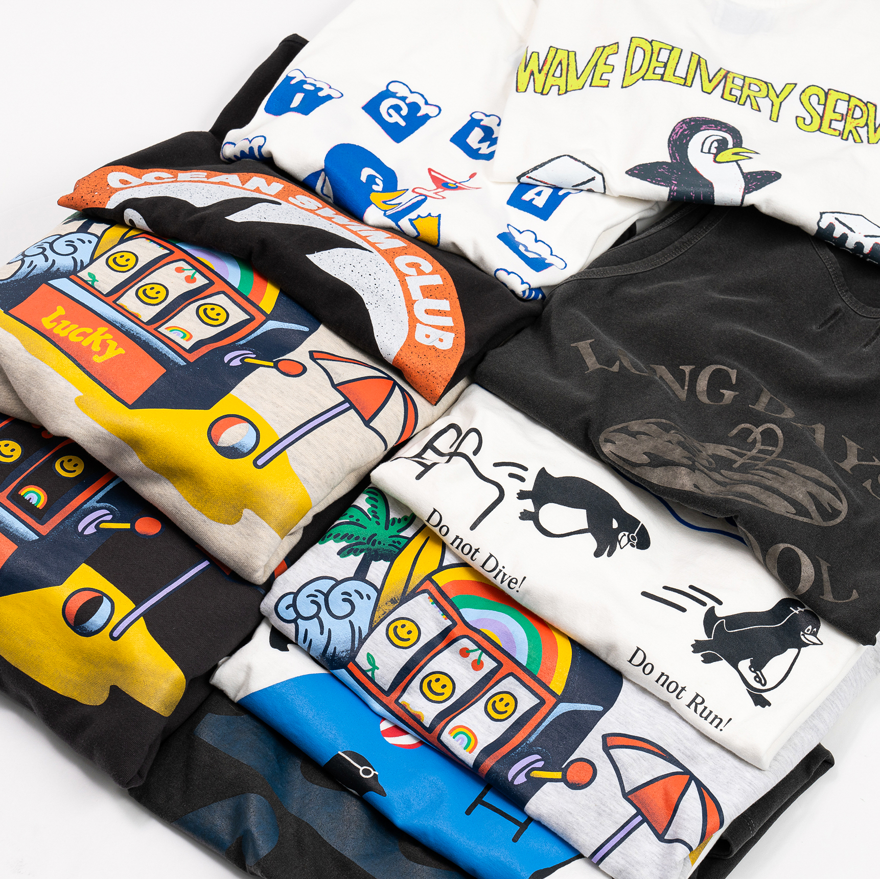 많은 브랜드가 그래픽을 단순한 요소로 활용하는 반면, 빅웨이브 컬렉티브는 그래픽 자체가 브랜드의 중심이에요. 그래서 매 시즌, 새로운 그래픽을 개발하는 데 많은 시간과 노력을 기울이고 있죠. 하나 하나 세어 보지는 않았지만, 지금까지 나온 그래픽이 1,000개가 넘을걸요? (아님 말고!) 아니라면 거의 비등할 겁니다 😅