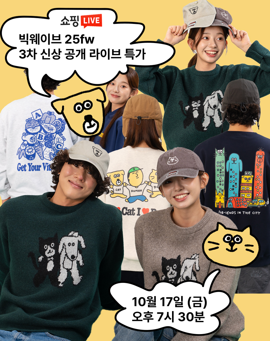 온 가족 냥냥 댕댕까지 함께 시청하며 빅웨이브의 새로운 컬렉션을 즐겨보세요. 이번 가을, 함께 웃고, 함께 입고, 함께 걷는 빅웨이브 라이브에서 만나요 🐾